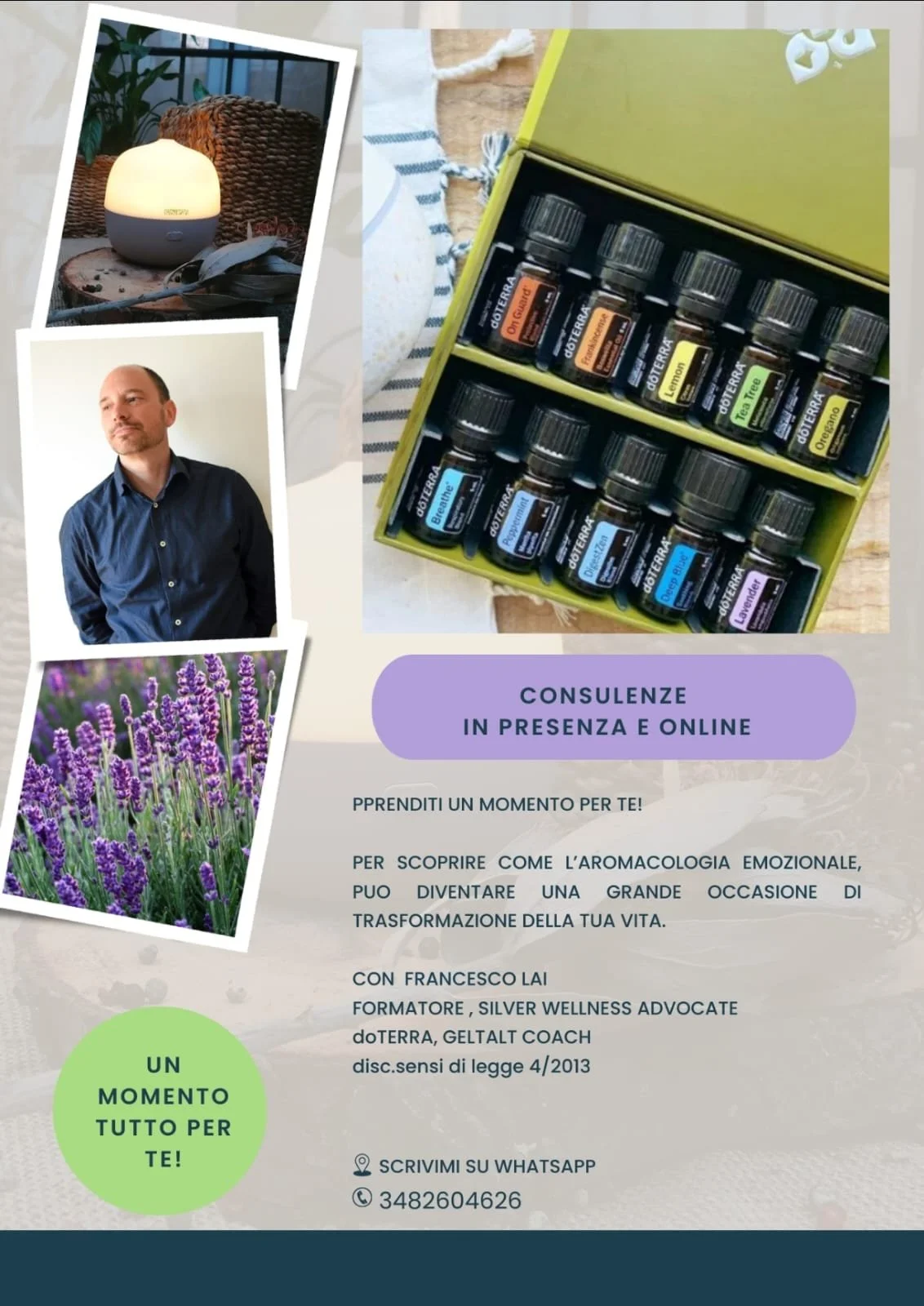 Dal 2018, unisco queste due anime nella mia attività di consulente per doTERRA, realtà leader nella produzione di oli essenziali puri di grado CPTG. La mia missione è divulgare la potenza di questi "doni della terra", guidando persone e professionisti del benessere a integrare gli oli essenziali nella quotidianità e nell'attività lavorativa, garantendo risultati concreti e sostenibili per il benessere psicofisico.
